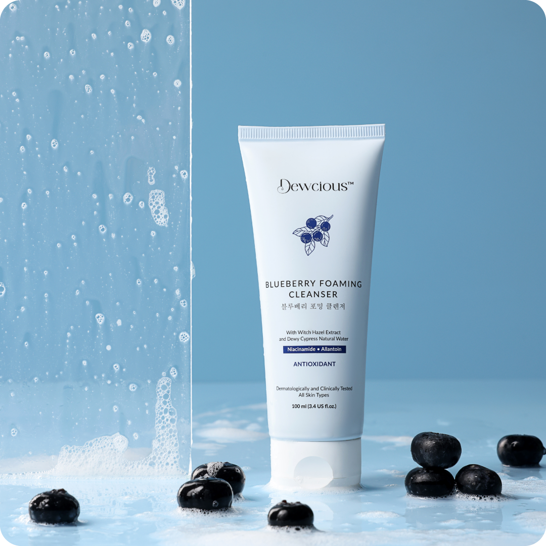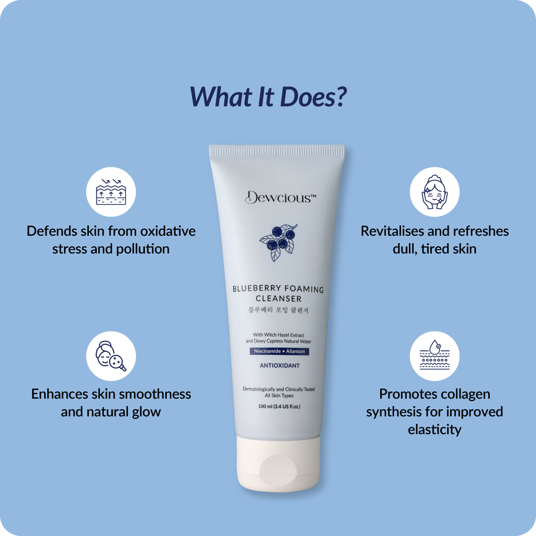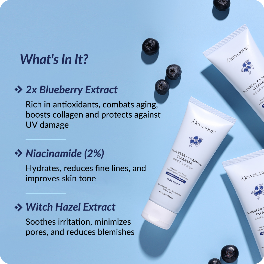 Reveal smoother, firmer skin with Dewcious Blueberry Foaming Cleanser. Infused with antioxidant-rich Blueberry Extract, this gentle yet effective formula helps combat free radical damage, boost collagen production, and strengthen the skin’s natural barrier. Niacinamide works to brighten and hydrate, while Witch Hazel soothes and refines the appearance of pores. Designed to revitalize dull, tired skin, it leaves your complexion soft, protected, and naturally radiant.