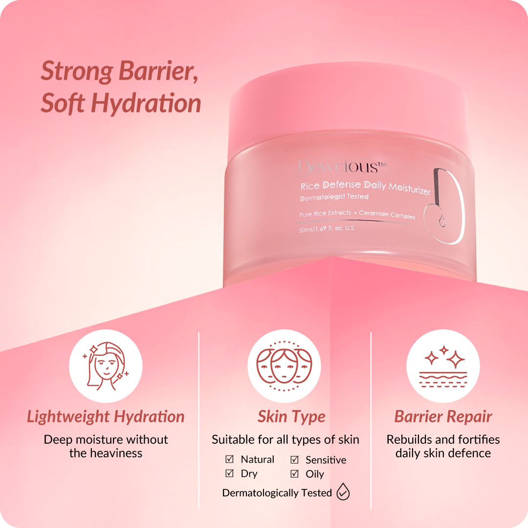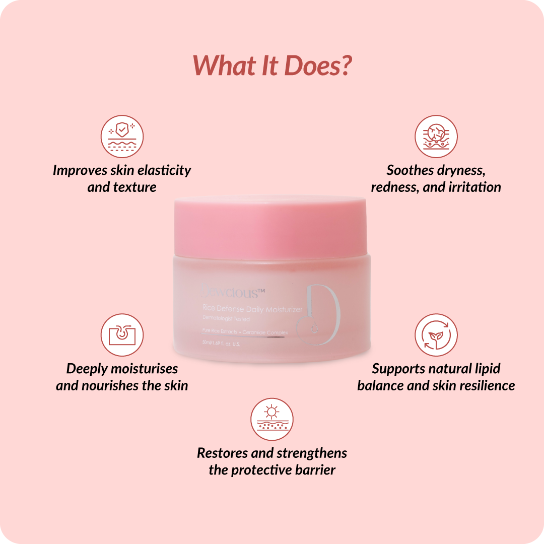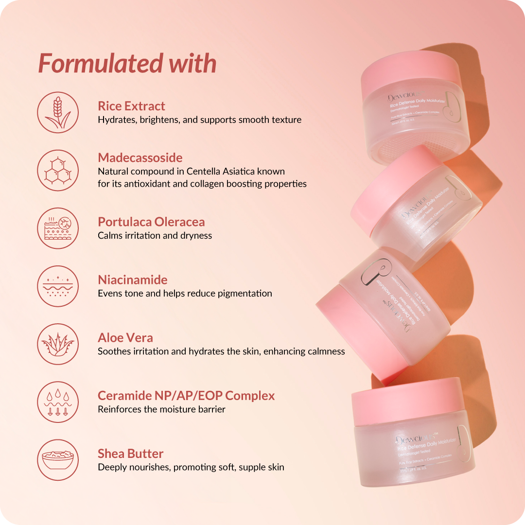 Dewcious Rice Defense Daily Moisturizer is your skin’s daily shield against dryness, irritation, and environmental stress. Enriched with pure Rice Extract and a potent Ceramide Complex, it works to repair and reinforce the skin barrier. Niacinamide brightens and evens out texture, while botanicals like Aloe Vera and Portulaca deliver long-lasting hydration and soothe inflammation. Lightweight and non-comedogenic, this moisturizer melts effortlessly into the skin, leaving it plump, calm, and resilient.