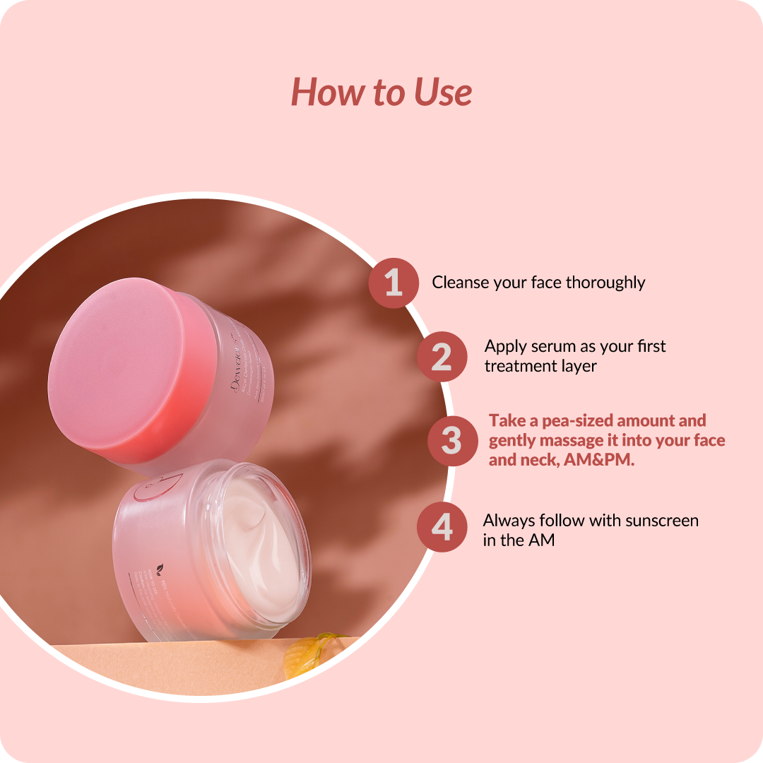 Cleanse your face thoroughly, apply serum as your first treatment layer, take a pea-sized amount and gently massage it into your face and neck, AM & PM, and always follow with sunscreen in the AM.